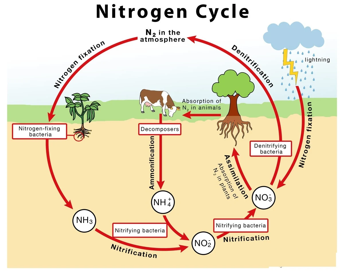 Periodic thunderstorms also contribute by converting atmospheric nitrogen into ammonia and nitrates, which return to the soil through precipitation, becoming available once again to plants.