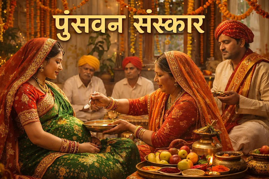 - विवरण: यह संस्कार गर्भधारण के तीसरे या चौथे माह में किया जाता है। ऐतिहासिक रूप से, पितृसत्तात्मक समाज में वंश वृद्धि के लिए पुत्र की कामना हेतु यह संस्कार महत्वपूर्ण माना जाता था।